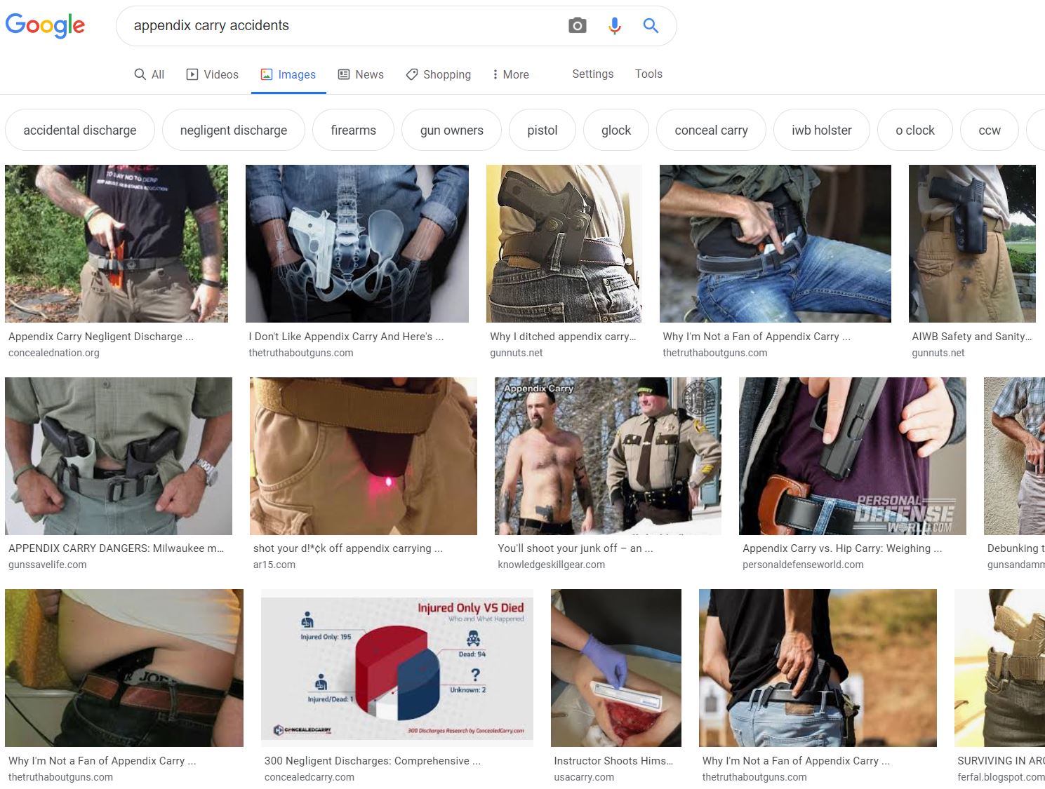Muzzling is an issue in every concealed carry method. And because of that, we encourage every CCW practitioner to adopt one of our four methods described above. We do not encourage appendix-carry-IWB, five-o’clock-IWB, or belly-band-carry . . . because the CCW practitioner’s femoral artery is vulnerable . . . unless one of our four rules above are implemented. Please Google appendix carry accidents you’ll find an abundance of images and videos illustrating the problem (snippet below). And muzzling can be a safety issue when re-holstering a firearm. This article illustrates the problem and the solution very well:
