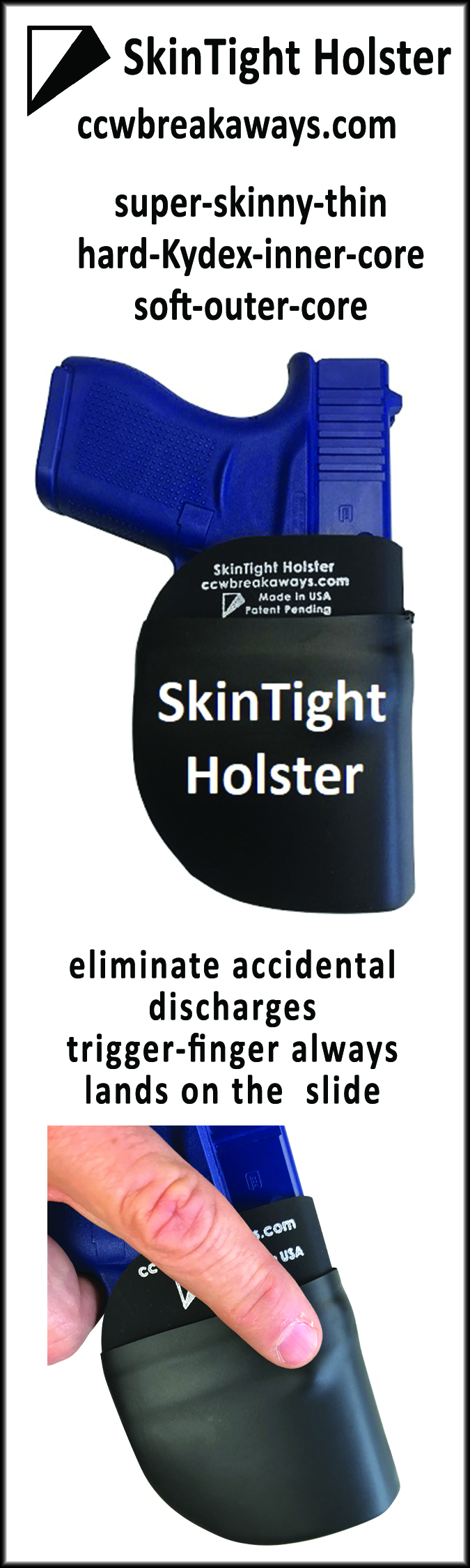 And finally, Trigger Finger Discipline needs to be addressed. When a gun is drawn from any concealed carry storage location, it almost always drawn from the blind. We have a trigger finger registration point on our SkinTight Holster that is a patent pending feature. We want to ensure that your finger ALWAYS ends up on the slide . . . not in the trigger guard area. The linked image below shows the How To Use the SkinTight video.